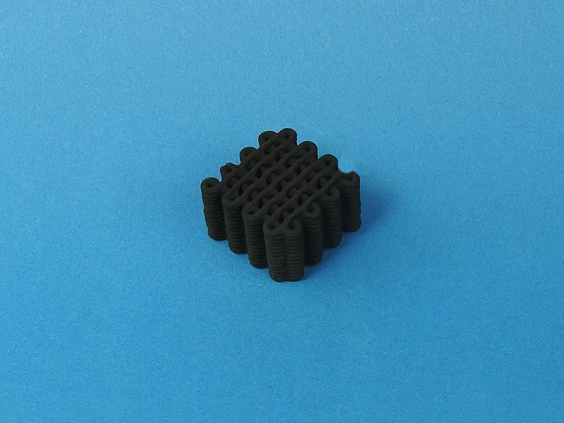 Scaffolds aus biokompatiblem Silikon für die Biotechnologie – unterschiedliche Porengrößen (links: 0,2 mm; rechts: 2 mm) und Strangstärken (links: 0,2 mm, rechts: 0,5 mm)